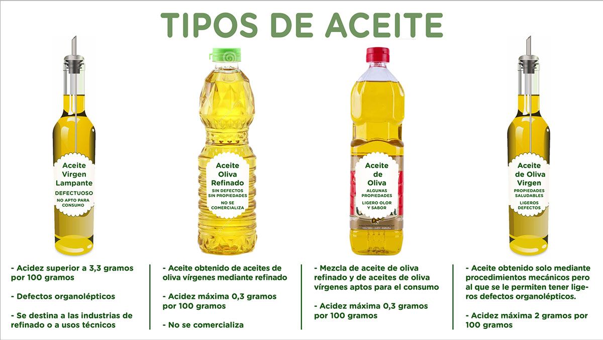 Dependiendo del resultado de ambas pruebas, el aceite podrá envasarse directamente, como es el caso del virgen y el virgen extra, o tendrá que pasar por un proceso químico, la refinación, para su posterior envasado como aceite de oliva, en sus nombres comerciales como suave o intenso. A continuación te presentamos los diferentes tipos de aceite: