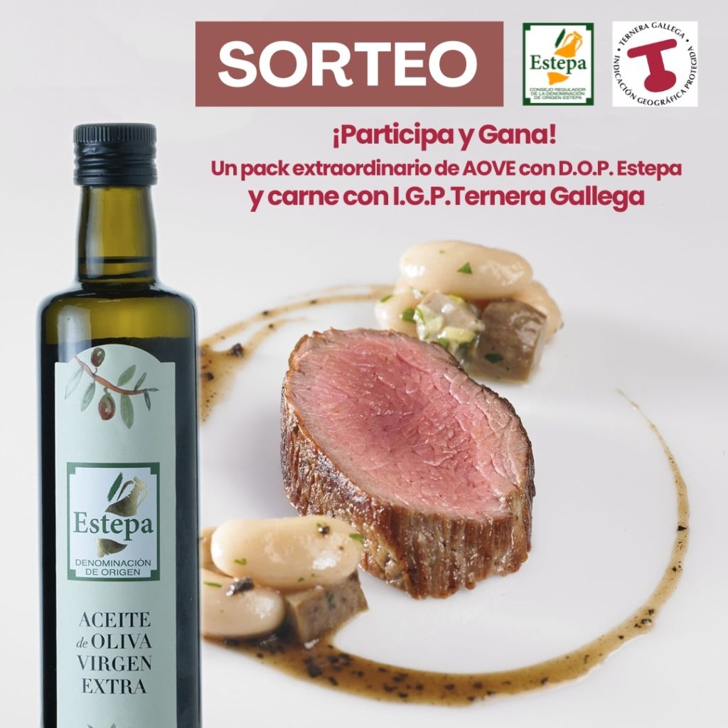 El premio del sorteo es un pack compuesto por 2 botellas de Aceite de Oliva Virgen Extra certificado por la Denominación de Origen Estepa, y un pack de Ternera certificada por Indicación Geográfica Protegida Ternera Gallega.